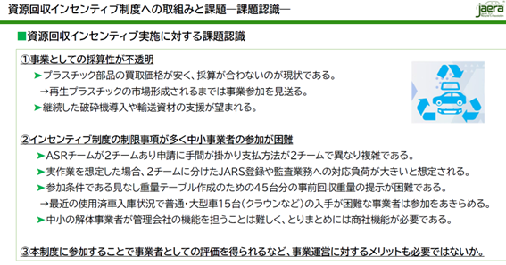 新しい解体インセンティブ制度では、解体業者からメーカーが想定している再生樹脂製造業業者に、安定して廃プラスチックを供給しなければならない。その供給源はしっかりとした解体業者でなければ、両チームはコンソーシアムを認定しないだろう。つまり、インセンティブ制度には不適正業者は参加できないはずである。ゆえに少なくない自動車解体業者・破砕業者も、外国人の経営するヤード等と競争するうえで、このインセンティブ制度に参加することで、使用済自動車の確保を少しでも増やしたいと考えている模様である。機構では自らの実証試験も参照に、図5に示したように、①事業としての採算性が不透明なことがまず、第1の課題であると主張した。これはマテック+北自協の先行研究でも、機構の今回の自主実証試験とも共通の結果として、採算性が取れるだけの支払いがなければ、このような事前の取り外しや破砕は解体業者にとってはコスト増となることを示す。とくに再生樹脂の相場も不透明で、鉄スクラップのような国際価格はないようだ。しかも今回のスクラップインセンティブ制度に参加する再生樹脂メーカーは、高度化財団の実証研究にたびたび参加しているいその株式会社や豊田通商が関係して創設したプラニック以外に、どの再生樹脂メーカーが参加するのか不明瞭である。実際に再生樹脂を製造するためにはバンパーに代表される樹脂部品を運送しなければならいないが、それはかさ高く、空気を運ぶような状況でまず採算性が合わない。ゆえに解体業者にとって本来不要な樹脂類専用の破砕機を導入しなければならなくなる。よって機構は、「継続した破砕機導入や輸送資材の支援が望まれる。」という要望を添えている。結論として、2025年10月現在の経済状況では、プラスチック部品の買取価格が安く、採算が合わないのが現状で、機構としては再生樹脂の市場が目に見えて形成されるまでは、事業参加を見送ることを宣言した。