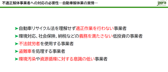 第2の要望は不適正事業者の撲滅 (国内事業者でのリサイクル処理を安定的に確保する必要あり)である。これは、外国人が経営している解体現場において実質的に環境に配慮した解体工程が行われているのかという、問いかけでもある。環境配慮型の解体作業を行うにはハード面での設備投資と同時に、ソフト面での労務費上昇、消耗品の増加等、行政や警察が不適正処理業者を市場から追い出さないので「悪貨は良貨を駆逐する」という事態になりつつある現状を訴えたものと考えられる。