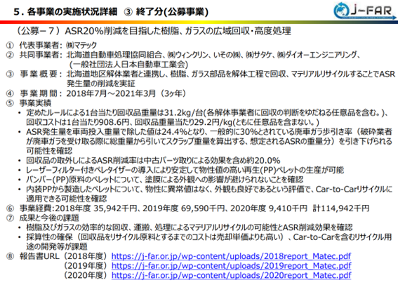 ところで、この解体インセンティブ制度の実証研究としては、すでに北海道の破砕業者(解体業も営んでいる)マテックが、やはり自動車リサイクル高度化財団から2020年度に受託した「ASR20%削減を目指した樹脂、ガラスの広域回収・高度処理」で問題点の抽出はある程度されてきたと思われる。(図6およびhttps://j-far.or.jp/wp-content/uploads/2020report_Matec.pdf)