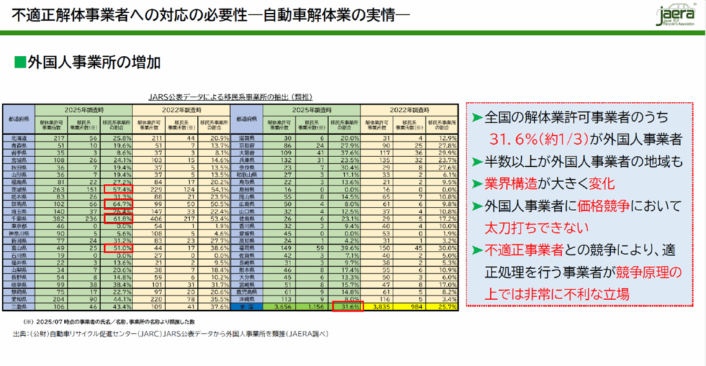 多くの解体業者が、日本でリサイクルビジネスをするのであれば、外国人経営者も、日本の法令に従い、日本の労働法規に準拠した労働者を雇い、納税や社会保険料の納付を行うべきである。それで初めて、彼らと公正な競争ができると指摘していることとも通じている。