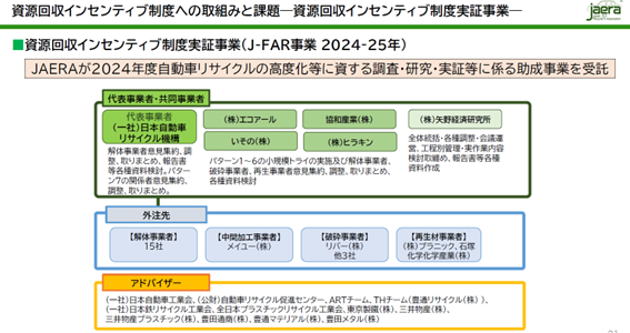 図4 日本自動車リサイクル機構が自動車リサイクル高度化財団から受託した解体インセンティブに関わる実証研究の参加企業、オブザーバー