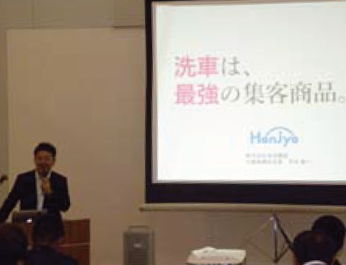 無料セミナーも開催。午前中は本荘興産の平井新一社長を講師に招いた。テーマは「洗車は最強の集客商品」として、来店客すべてに無料洗車を続けるうち、結果的に売上が5 倍になった事例などを紹介した。