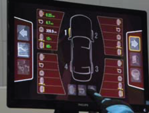 上記の「Fomulra UNIFORMITY」に付属のモニター。4輪のロードフォース測定後、前後左右どの位置にどのタイヤ・ホイールを組み付ければ最適かを自動診断し、入れ替えの指示を表示する。